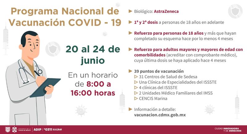 El Gobierno de la Ciudad de México anunció que continuará con la jornada de vacunación contra Covid-19 para adultos de 18 años de edad en adelante, esta vez habilitó 39 unidades vacunadoras a las que podrán acudir los habitantes de cualquiera de las 16 alcaldías de la capital del país.