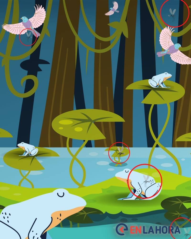 En esta prueba, encontrarás una imagen donde se observan muchos animales, entre moscas y ranas, pero hay un animal que no pertenece ahí "Los mosquitos", y tú tendrás que ponerte a prueba para encontrarlo. Inténtalo y descubre si formas parte del uno por ciento de los usuarios que han hecho este reto elaborado y lo han superado.