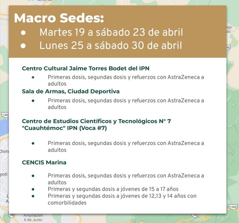 Esta jornada de vacunación contra el virus SARS-CoV-2 finalizará el próximo sábado 30 de abril, además del Metro podrás vacunarte en: