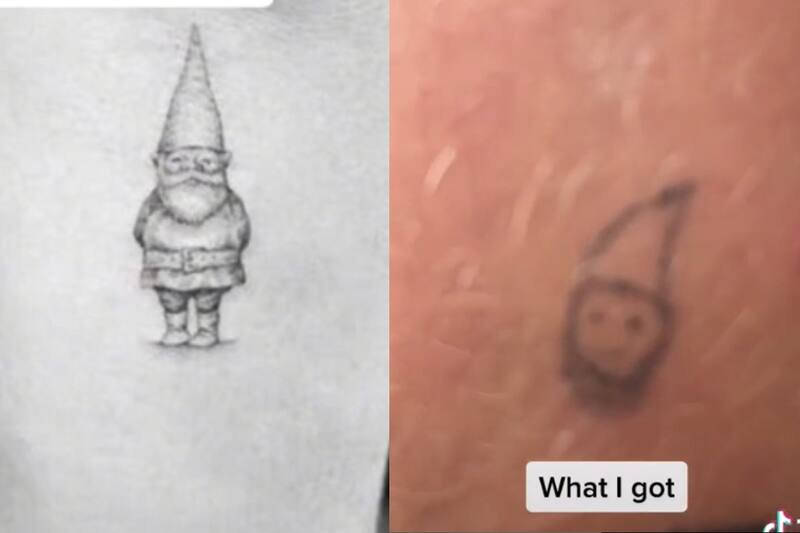 Lo que le tatuaron a esta Tiktoker no tiene nada que ver con lo anterior y hasta parece un dibujo hecho con pluma por algún niño pequeño. Un círculo simulando la forma de la cara del gnomo, un triángulo, que quiere imitar la forma del gorro, y dos puntos en el lugar de los ojos es lo que conforman a este tatuaje.