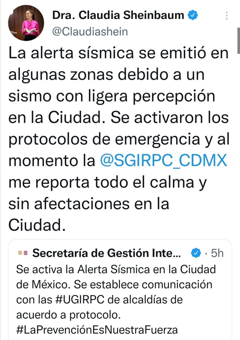 Diversas autoridades del Gobierno de la Ciudad de México informaron a través de sus redes sociales cómo se encontraba la capital y ciudadanía tras el sismo registrado durante la madrugada de este viernes: