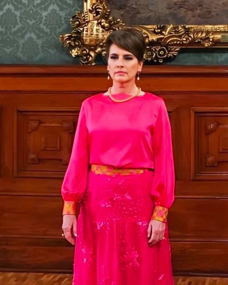 La primera dama, Beatriz Gutiérrez Müller, lució un conjunto de dos piezas en color rosa mexicano con detalles en dorado. La blusa con mangas plisadas en la parte inferior y con puños anchos con bordados en dorado, acompañaron a una falda de encaje con corte a la cadera y ligero plisado.