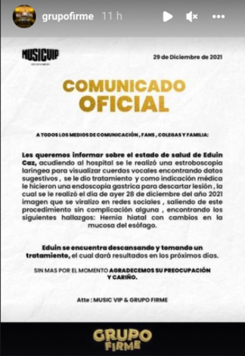 A través de un comunicado oficial por parte de Music VIP & Grupo Firme, se dio a conocer que después de varios estudios, Eduin presenta una hernia hiatal.