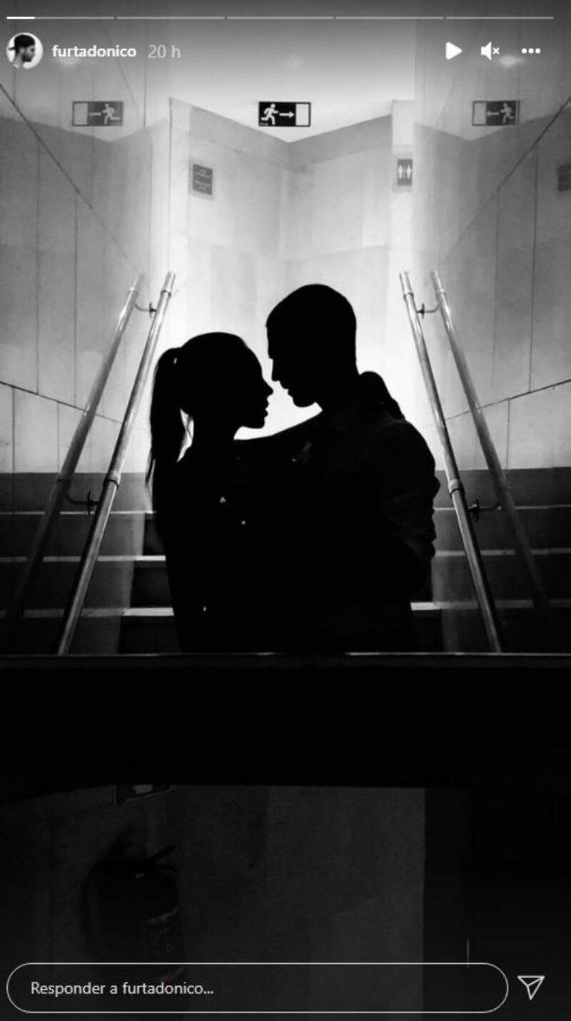 En la imagen a contraluz se puede ver a Expósito abrazada del cuello de su novio al pie de unas escaleras.