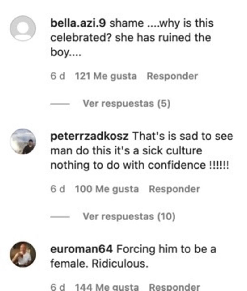 Entre los comentarios se pueden leer: "¿Muchas celebridades están adoptando a estos bebés varones de países africanos y luego los hacen usar vestidos?" o "vergüenza ... ¿por qué se celebra esto? ella ha arruinado al chico ..."