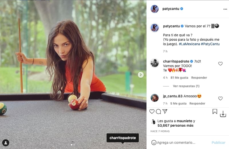 Por su parte, la intérprete de "Corazón Bipolar", correspondió la publicación de Christian Vázquez, y compartió un par de fotografías en las que aparece frente a una mesa de billar, en cuya descripción, escribió: "Vamos por el 7? 🤍🎱 Para ti de qué va ?