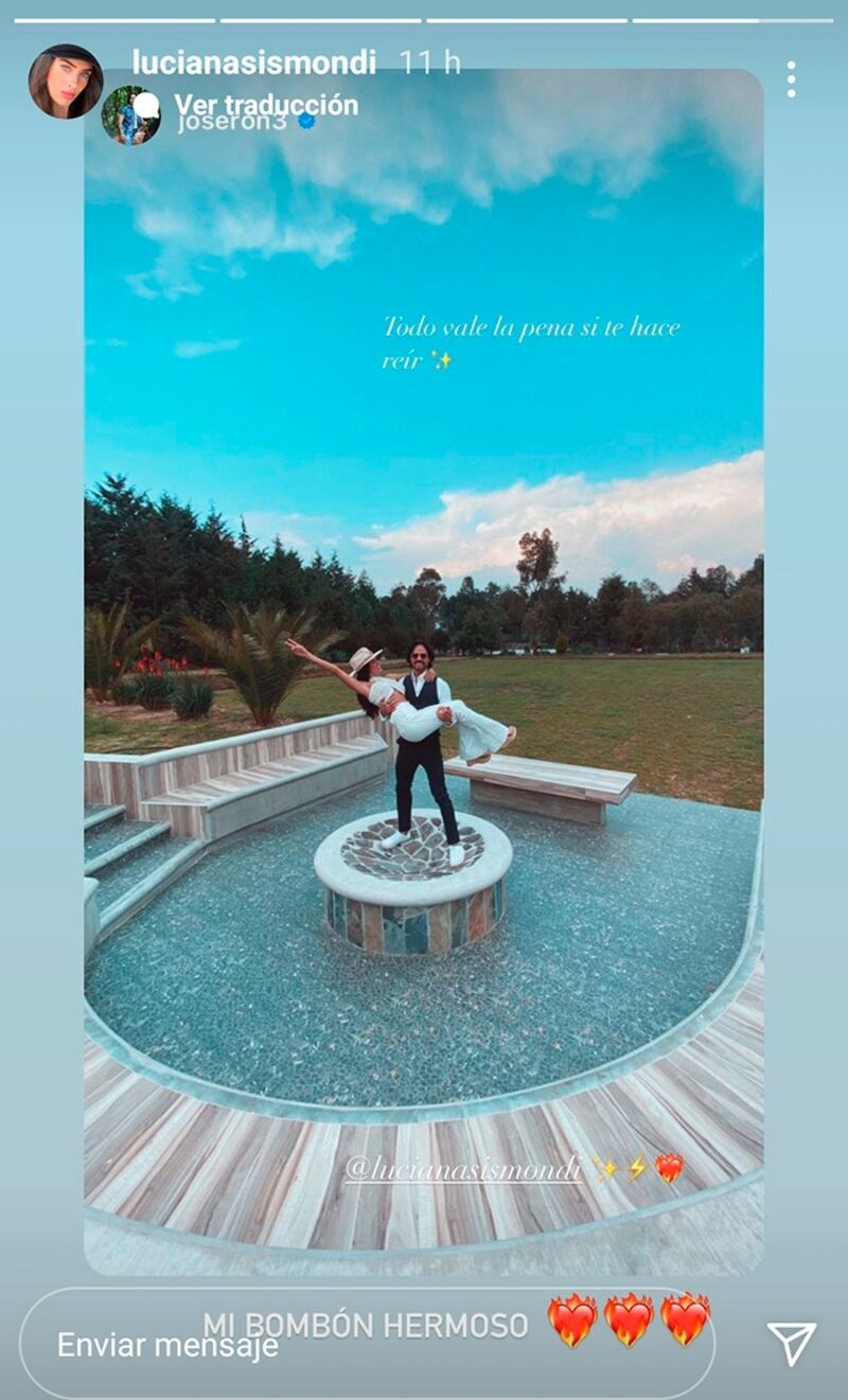 El galán de telenovelas compartió en su Instagram una bella postal en la que se le ve cargando a la presentadora argentina. "Todo vale la pena si te hace reír", escribió junto a la imagen, etiquetando a su guapa acompañante, quien por su parte replicó la imagen en su propia cuenta, agregando el mensaje: "Mi bombón hermoso".