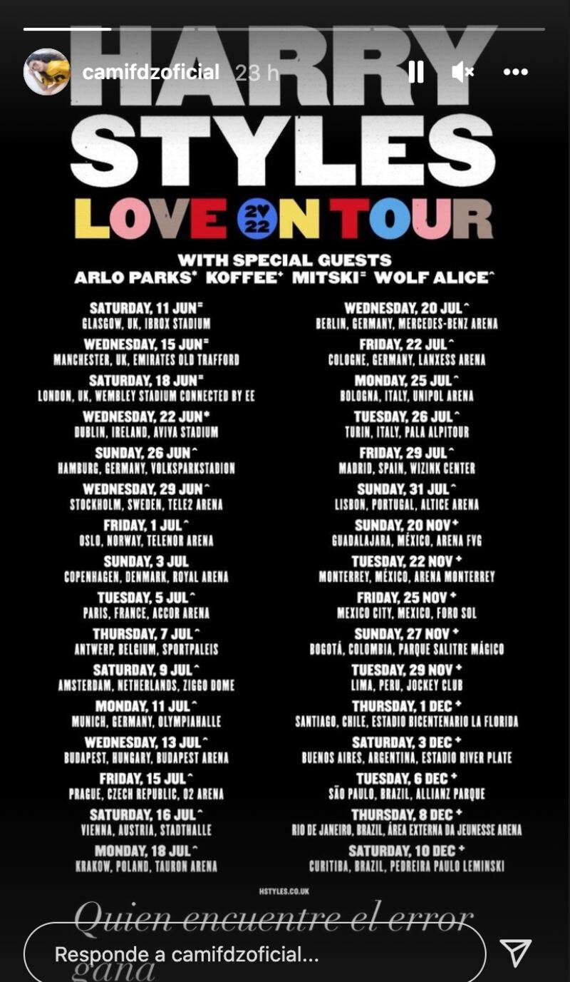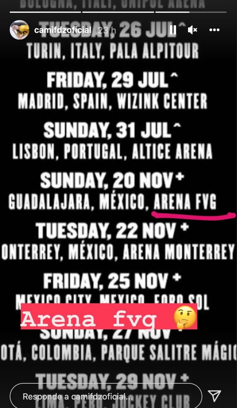 En la primera historia Camila publicó el cartel de la gira, pensamos que solamente estaba emocionada por el regreso de Harry Styles a México, pero no fue así al ver las historias siguientes. En la segunda hizo un acercamiento y en la tercera que ya se notaba mucho mejor el error. Lo subrayó y escribió "¿Arena FVG?".