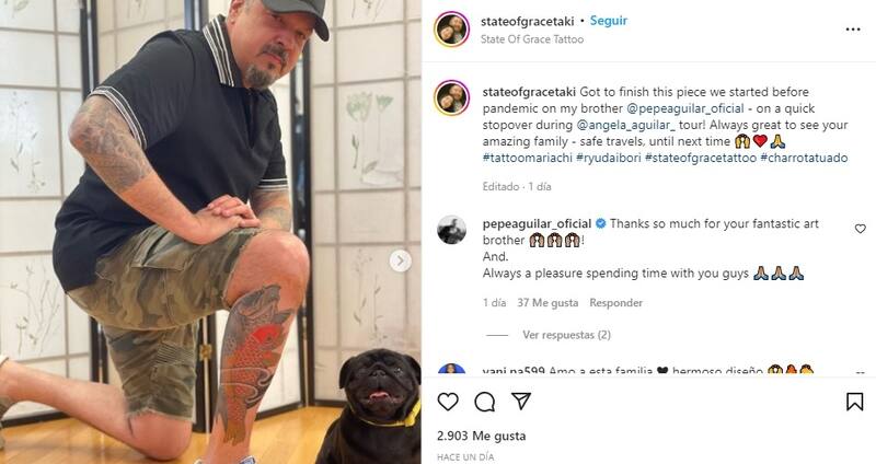 Fue justo el tatuador el que compartió más detalles del diseño que realizó en la pierna del cantante. "Terminamos esta pieza que empezamos antes de la pandemia con mi hermano @pepeaguilar_oficial - ¡En una parada rápida durante la gira de @angela_aguilar_! Siempre es bueno ver a tu increíble familia: viajen seguros, hasta la próxima", escribió el artista con una foto más de cerca de su trabajo.