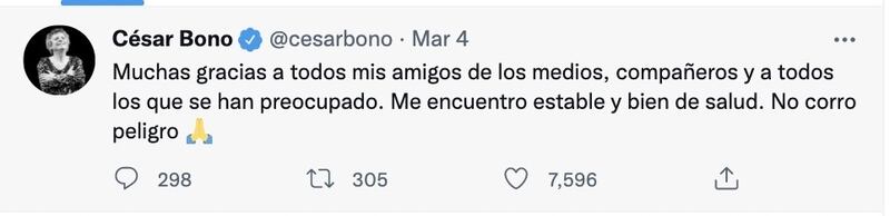 César Bono fue hospitalizado de emergencia en Ciudad de México la noche del 3 de marzo. Aunque las causas no se informaron, el actor publicó en su cuenta de Twitter que se encontraba "estable, sano y sin peligro". Mientras que su hija se dedicaba a pedir donares de sangre.