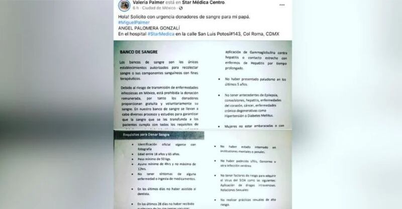 "¡Hola! Solicito con urgencia donadores de sangre para mi papá Miguel Palmer Ángel Palomera Gonzalí, en el hospital Star Medica en la calle San Luis Potosí #143, Col Roma, CDMX", escribió en sus redes sociales.