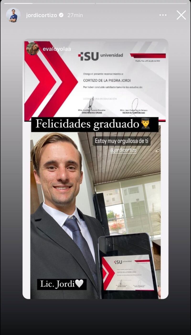 Jordi Cortizo, jugador del Puebla, se recibió este martes como licenciado en Educación en el Instituto Suizo. El futbolista de la Franja de la Liga MX compartió mediante redes sociales que terminó el grado y fue festejado por su familia y seres queridos.