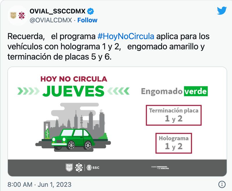 Es importante destacar que la CAMe puede modificar el programa Hoy No Circula en episodios donde haya una mala calidad del aire. Sin embargo, para este jueves 1 de junio, el programa se aplica con normalidad.