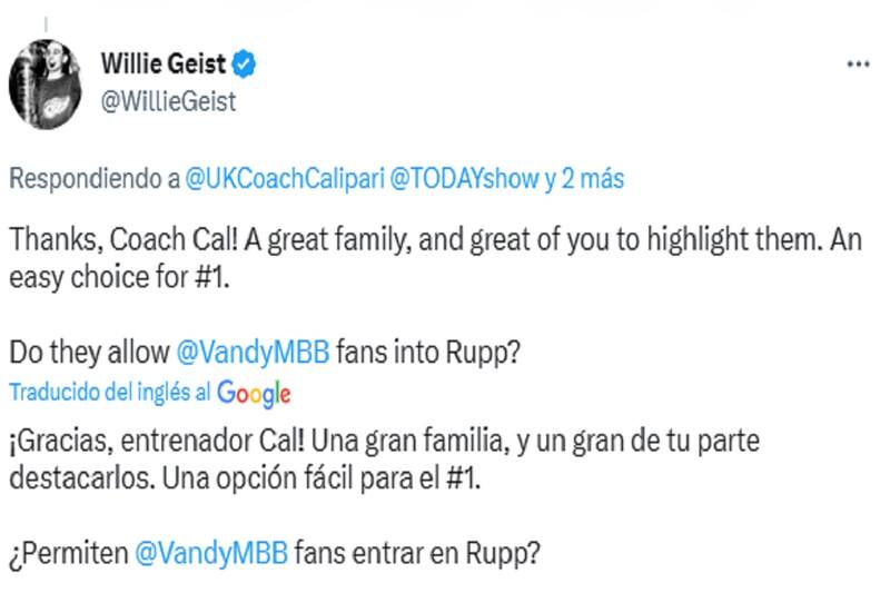 “No sé quién es, pero tengo entradas para él y su familia en Rupp’s (restaurante) para ser tratados como VIP”, mencionó el entrenador.