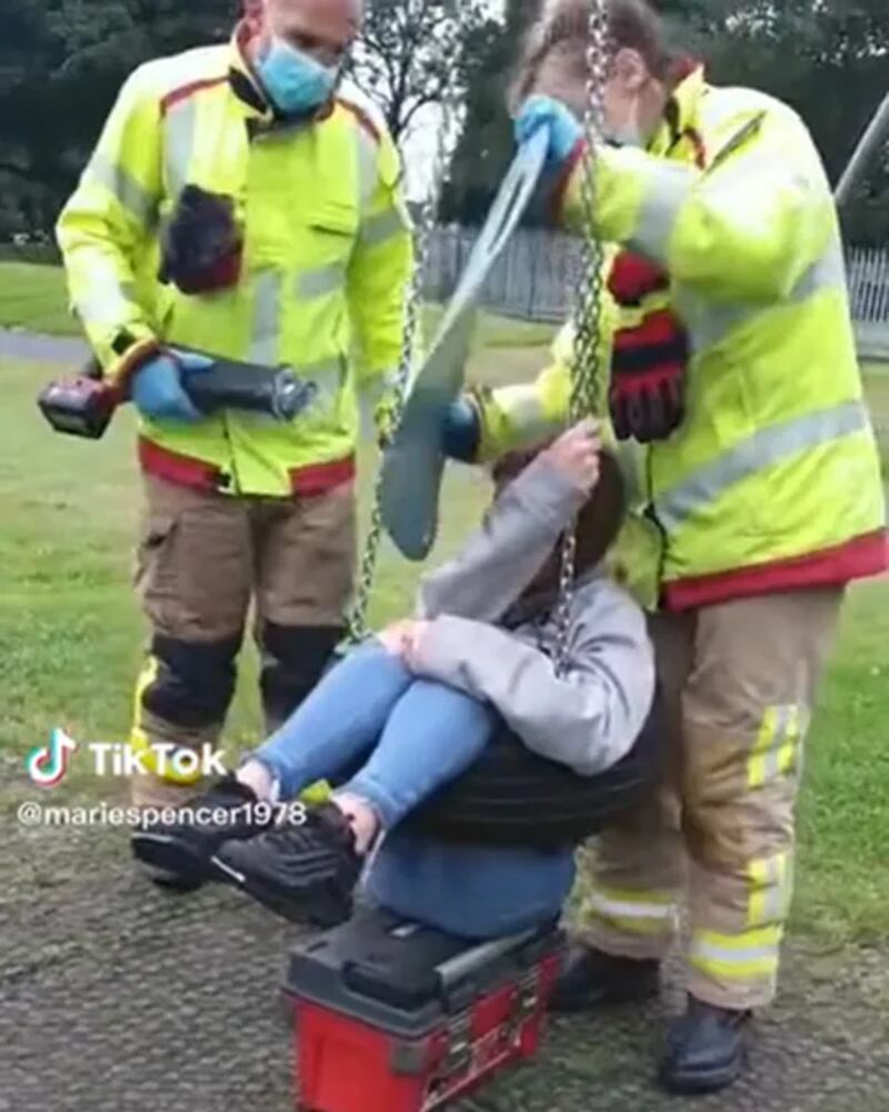 @mariespencer1978, usuario de Tiktok, capturó el momento único que vivió la joven y decidió compartirlo en su cuenta: “Sólo mi hija Keira se puede quedar atascada en un columpio”, se lee en el primer video que documentó el calvario de la joven.