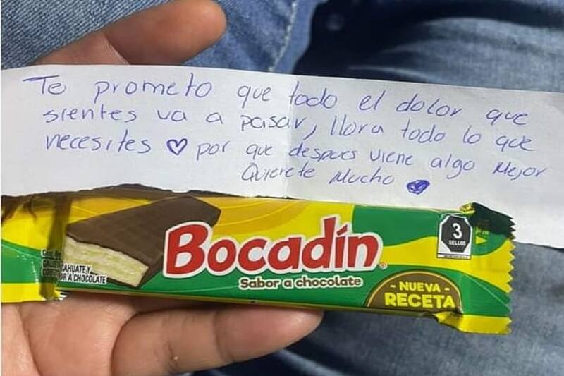 Al parecer más de una persona se percató que este estaba pasando por un mal momento, pero una joven tuvo el valor de acercarse a él y entregarle una nota con un chocolate.