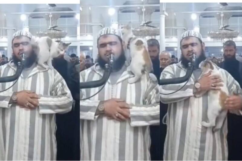 En una oración nocturna del mes sagrado musulmán del Ramadán en Argelia un hermoso gato decidió participar intentando distraer al imán Walid Mehsas mientras rezaba la Tarawih, pero no lo logró.