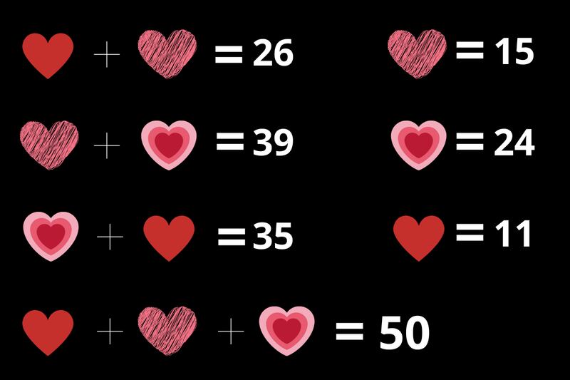 ¿Crees que tienes lo necesario para resolver este reto? Cada corazón tiene asignado un número diferente, y tendrás que encontrar cuál es para poder descifrar el resultado de la suma final.