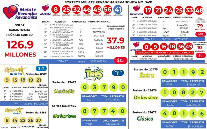La Lotería Nacional llevó a cabo este jueves, 8 de septiembre, los sorteos de las cinco modalidades de TRIS, los dos sorteos de Chispazo y los tres de Melate. Aquí te presentamos los números y combinaciones ganadoras: