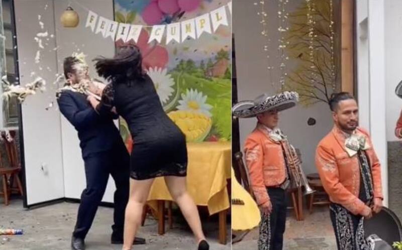 Cuando llegó el mariachi para amenizar la reunión frente un grupo reducido de invitados, la novia arrojó su pastel de cumpleaños en la cara de su novio infiel.