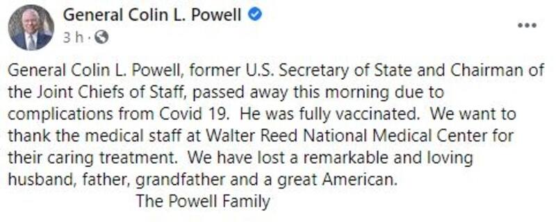 "El general Colin L. Powell, exsecretario de Estado de los Estados Unidos y presidente del Estado Mayor Conjunto, falleció esta mañana debido a complicaciones del Covid 19. Estaba completamente vacunado. Queremos agradecer al personal médico del Centro Médico Nacional Walter Reed por su atento tratamiento. Hemos perdido a un esposo, padre, abuelo y un gran estadounidense extraordinario y amoroso. La familia Powell".