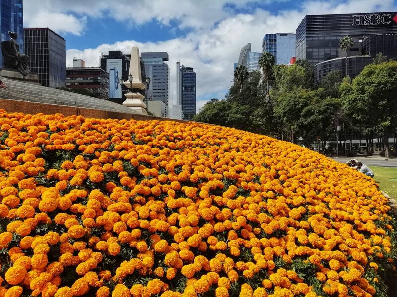 Una monumental catrina hermosa de cempasúchil que ha dado color y aroma a todo el pueblo de Guerrero.
