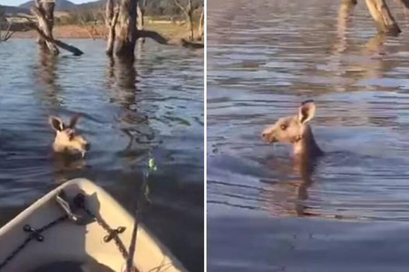 Al tratar de cruzar el campo terminó siendo arrastrado por la corriente. Hubo momento en que el canguro buscaba desesperadamente acercarse a tierra, pero logro nadar hacia la orilla y siguió su camino a salvo.