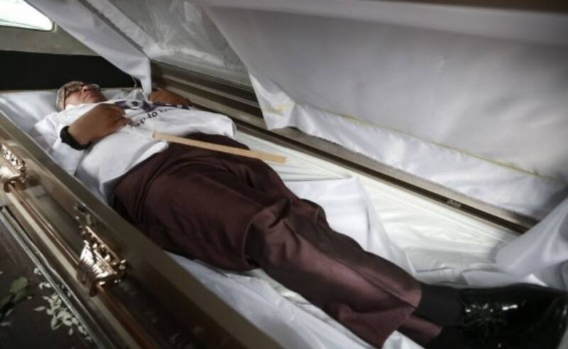 El candidato a diputado federal por el Distrito 2 del Partido Encuentro Social, Carlos Mayorga, realizó la representación de un funeral, incluyendo peritos, dolientes, féretro y carroza fúnebre.