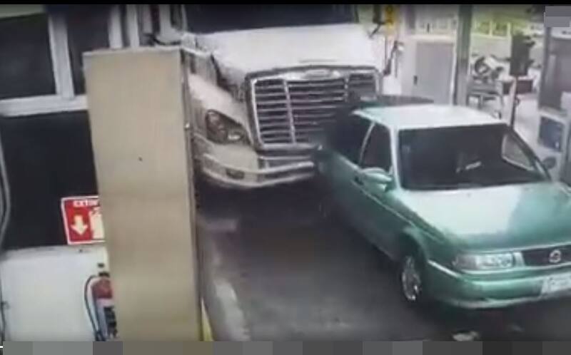 En la grabación, que fue captada por una cámara de seguridad, se observa cómo el tráiler choca primero contra un vehículo que arrastra hasta la caseta de cobro e impacta con un Tsuru, color azul, que pagaba su peaje y recibió todo el impacto del tracto camión. Todos los ocupantes fallecieron.