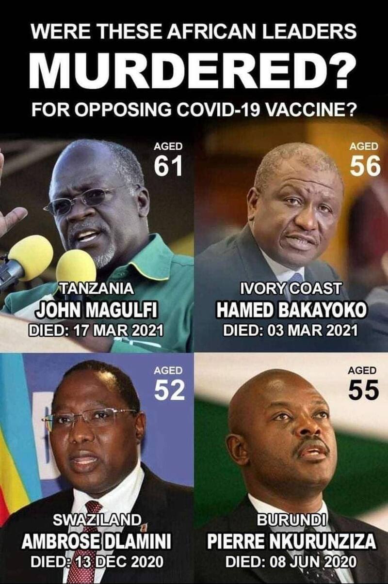 En las últimas semanas, comenzó a circular por redes sociales un meme, que asegura que tres presidentes murieron "inesperadamente" tras rechazar las vacunas para sus paíes, Haití, Tanzania y Zambia, sin embargo no existe evidencia de que exista una conexión entre sus fallecimientos y la teoría conspirativa.