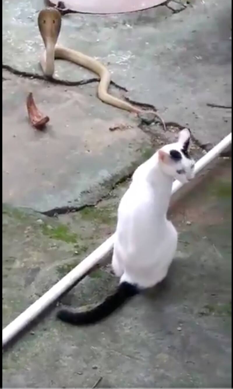 Un nuevo vídeo viral muestra el momento en el que un valiente gato doméstico aparece en guardia a menos de un metro de distancia de una imponente cobra en la India, el felino intentó evitar que el reptil entre a la casa de sus dueños. En las imágenes se puede distinguir como mola serpiente estaba siendo vigilada por un minino blanco de complexión regular que no se mueve ante la postura amenazante, interponiéndose entre ella y su hogar.