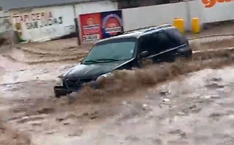En redes sociales circulan videos de cómo las lluvias provocaron una creciente de agua que afectó varias avenidas de la ciudad, arrastrando todo lo que se encontraba a su paso, incluidos puestos de burritos y automóviles estacionados.