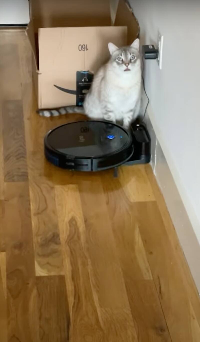 La dueña de la mascota, Kristi Berry. filmó el momento justo cuando se activó un Roomba cerca de él. El mínimo de nombre "Nicholas" tiene cinco años. Vive en Brooklyn, Nueva York en Estados Unidos. Cuando de repente la máquina comenzó a moverse, "Nicholas" saltó lejos, se asustó mucho.
