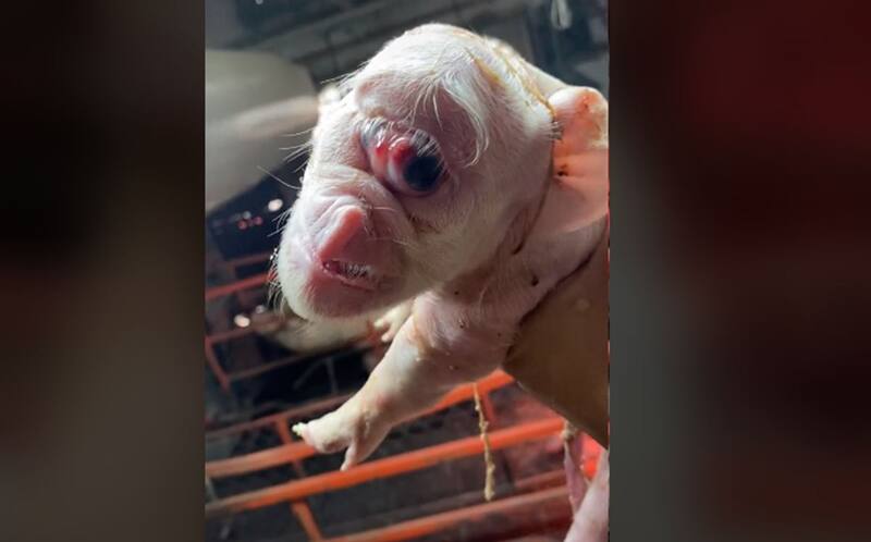 La grabación, compartida en la popular red social por el usuario @carlosvaladezv quien trabaja en un criadero de cerdos y suele compartir clips sobre su trabajo, se muestra a un lechón recién nacido con "aspecto extraño" por haber nacido con los ojos y la nariz deformada.