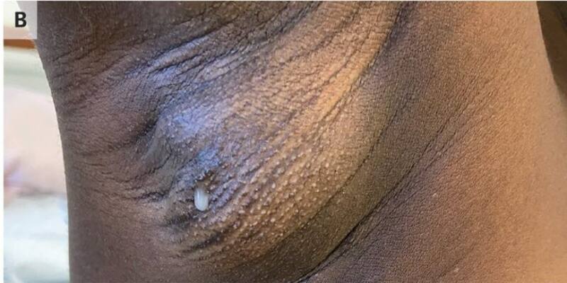 El informe, publicado el 29 de julio, señala que la mujer, de 26 años, desarrolló un dolor en la axila derecha dos días después de dar a luz. Al examinarla, los médicos encontraron una masa redonda en su axila que "liberó una secreción blanca cuando se presionó".