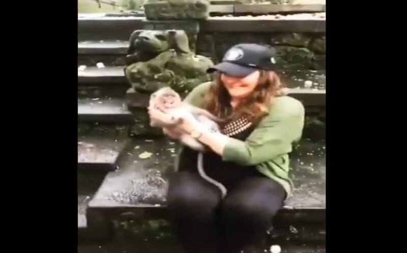 Al principio, la mujer trató con cuidado al monito e incluso le rascó la espalda, pero la cría se mostraba inquieta, incómoda y nerviosa; cosa que no gustó mucho a la turista pues no podía tomarse la fotografía del recuerdo. Así que, después de unos segundos de espera, ésta lo sujetó de la cabeza, cosa que molestó al bebé quien no tardó en mostrar sus dientes y emitir un grito de auxilio para que en cuestión de segundos su madre que se encontraba cerca apareciera en la escena y lo rescatara. Al ver que la madre del pequeño saltó sobre su hombro, la visitante no dudó ni por un segundo en soltarlo y gritar.