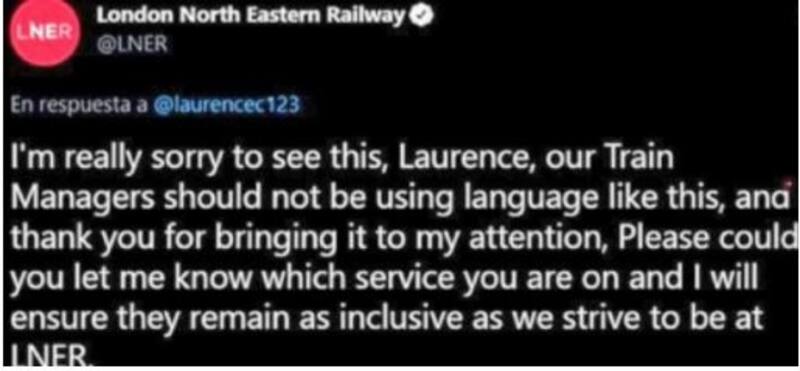 "Lamentamos mucho ver esto, Laurence, nuestros gerentes de trenes no deberían usar un lenguaje como este, y agradezco que nos hayas llamado la atención. Por favor, ¿podría informarme en qué servicio se encuentra y me aseguraré de que sigan siendo tan inclusivos como nos esforzamos por ser en LNER?".