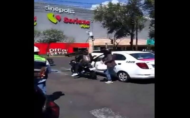 Al parecer la molestia de la mujer fue detonada porque el taxista les cerró el paso, por lo que su acompañante (quien por cierto no usaba casco) decidió parar y enfrentarlo, el conductor de la unidad de transporte era una persona mayor, cosa que no detuvo a la pareja que no paró de gritarle cosas y amenazar al señor. Tras algunos minutos de dimes y diretes la mujer que vestía pantalón de mezclilla y un chaleco, con ayuda de un pequeño tanque blanco (aparentemente de gas) se acercó al vehículo y le rompió la ventana.