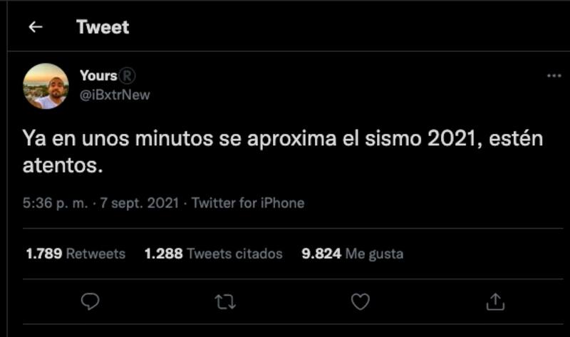 Por más extraño e increíble que parezca, hubo un usuario en Twitter que anunció hoy el sismo antes de que sucediera, la cuenta, que aparece en la red social como @iBxtrNew, y que lleva como sobrenombre "Yours", publicó un "tuit en el que se leer: "Ya en unos minutos se aproxima el sismo 2021, estén atentos".
