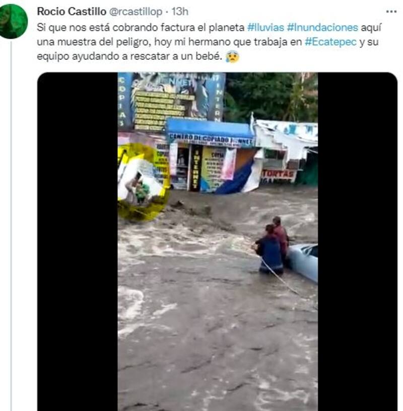 "Si que nos está cobrando factura el planeta #lluvias #Inundaciones aquí una muestra del peligro, hoy mi hermano que trabaja en #Ecatepec y su equipo ayudando a rescatar a un bebé".