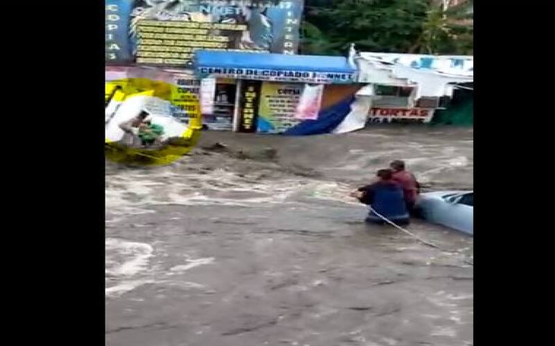 En redes sociales circularon varios videos de las inundaciones, uno de los que llamaron más la atención fue el de un hombre y su bebé que quedaron atrapados en un puesto de lámina pero lograron ser rescatados por un grupo de hombres que con ayuda de una cuerda pudieron ponerlos a salvo.