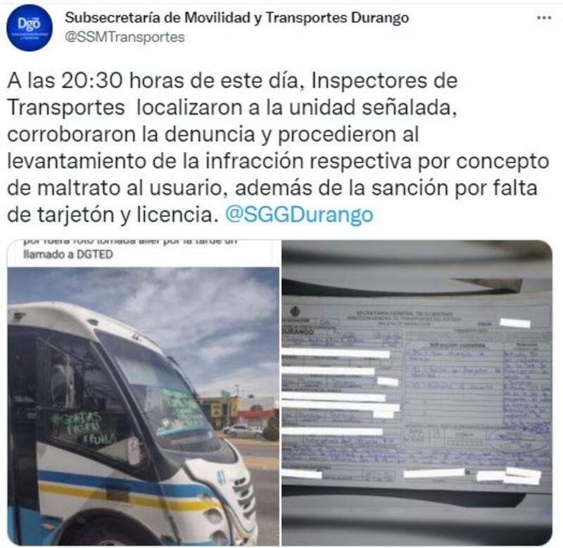 A través de su cuenta de Twitter, la dependencia estatal informó que logró ubicar a la unidad en cuestión y emitió la sanción correspondiente por concepto de "maltrato al usuario", además se multó al conductor porque no portaba licencia de conducir ni tarjetón.
