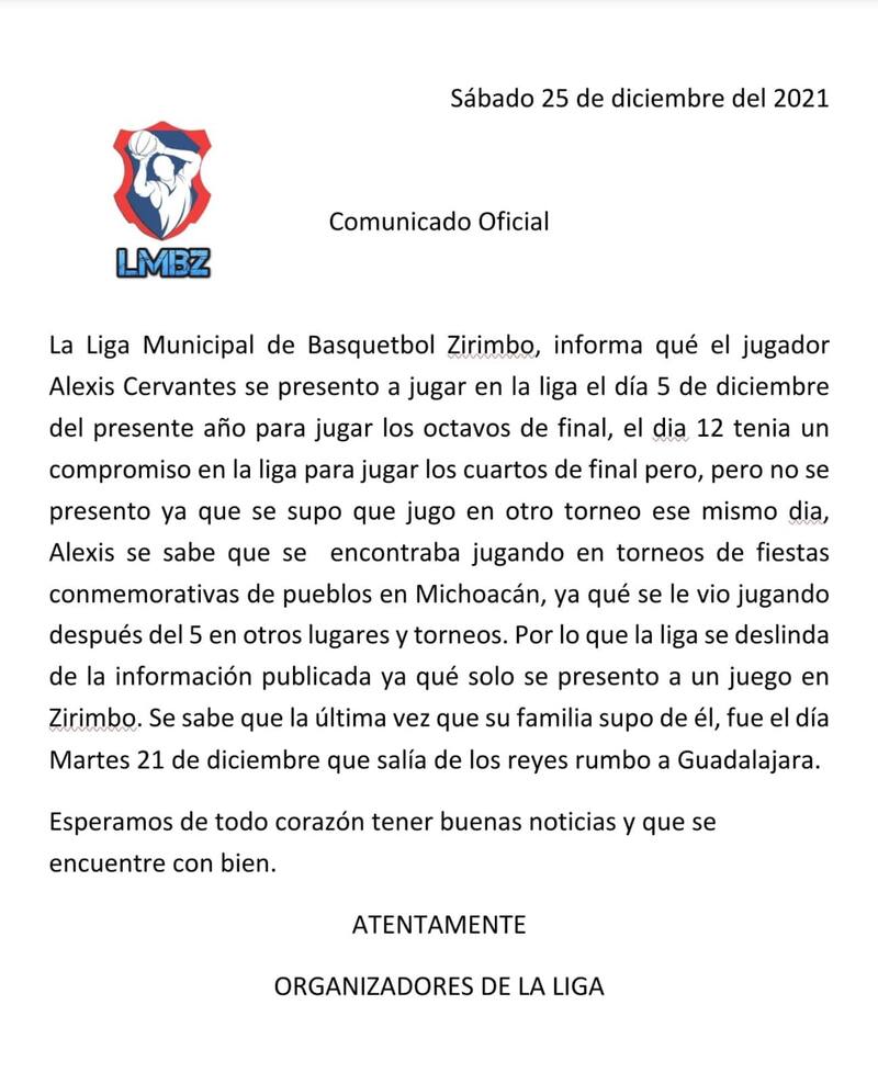 La misma Liga de Zirimbo precisó que cuenta con información de que Alexis Cervantes participó en diversos torneos de basquetbol que se realizaron en varios municipios de Michoacán, como parte de festividades locales, aunque se reservó el nombre de los poblados.