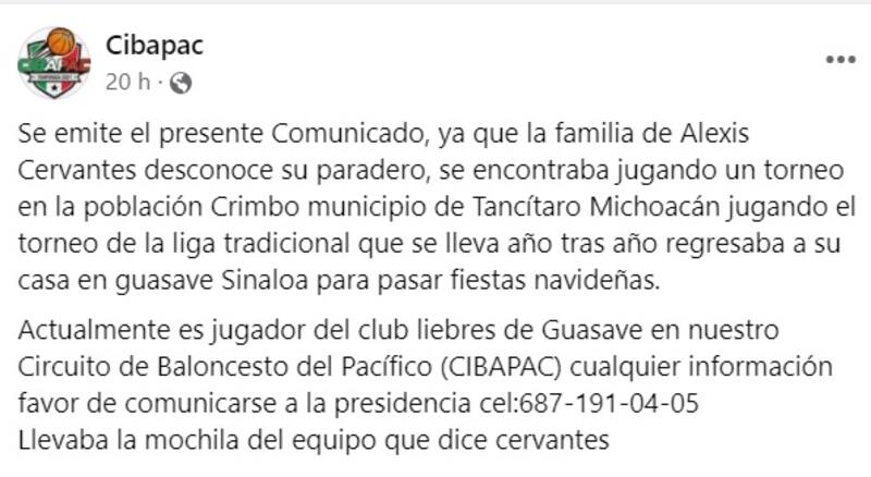 El Circuito de Basquetbol del Pacífico (Cibapac), una liga profesional en desarrollo en el noroeste de México, informó que Cervantes desapareció el pasado martes en Michoacán, donde participó en tradicionales partidos amateurs de fin de año.
