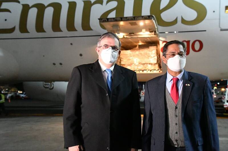 Ebrard estuvo presente a pie de pista en el Aeropuerto de la Ciudad de México junto con el embajador de la India en México, Mampreet Vohra, cuando un avión de la compañía Emirates aterrizó de madrugada con el cargamento de fármacos.