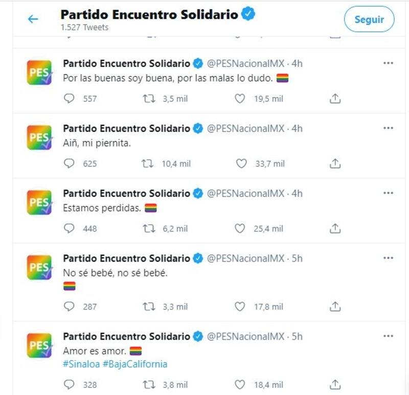 Dentro de los mensajes que aparecen en la línea del tiempo de las redes sociales del partido el "amor es amor", "tendremos más likes que votos, por un México para todos y todas", "los derechos para todo por igual", "por las buenas soy buena, por las malas lo dudo", "estamos perdidas", entre otros.