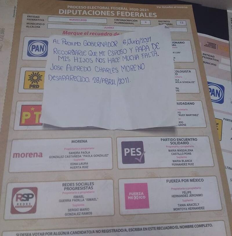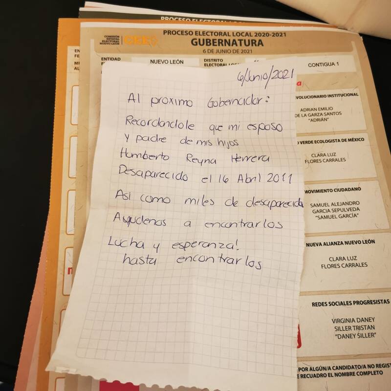 En otra misiva, un votante escribió: "Al próximo gobernador: Recordándole que mi esposo y padre de mis hijos, Humberto Reyna Herrera, desaparecido el 16 de abril de 2011, así como a miles de desaparecidos. Ayúdennos a encontrarlos. Lucha y esperanza hasta encontrarlos".