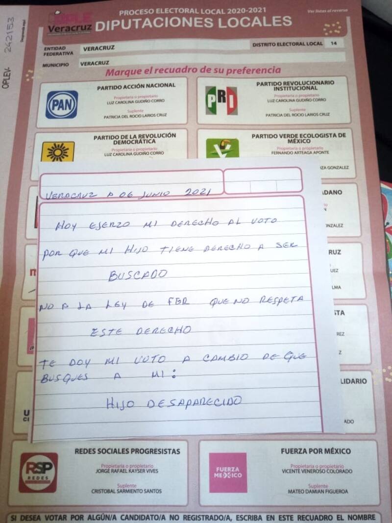 "Hoy ejerzo mi derecho al voto porque mi hijo tiene derecho a ser buscado. No a la ley de FGR que no respeta este derecho. Te doy mi luto a cambio de que busques a mi hijo desaparecido", se lee en una carta fechada este 6 de junio en Veracruz.