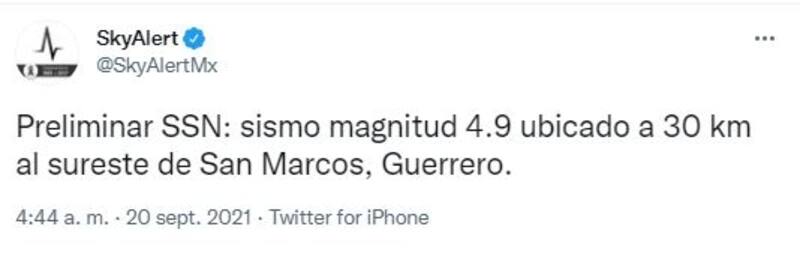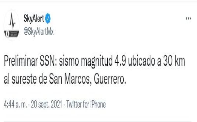 Resulta pues, que durante la madrugada de este lunes 20 de septiembre, la aplicación SkyAlert emitió una alerta de sismo para sus usuarios. De acuerdo a la información que llegó a través de los teléfonos celulares de algunas personas, el movimiento registrado fue de 4.9 grados con epicentro en Guerrero. En la imagen se puede apreciar claramente que trató de un temblor de "intensidad leve".