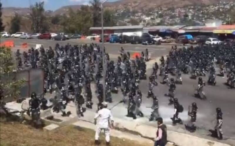 De acuerdo con información emitida por la Guardia Nacional, sus elementos intentaron establecer un diálogo con los manifestantes, pero ellos se negaron y entonces empezó una acción de repliegue, que de acuerdo con la dependencia se realizó apegada al uso proporcional de la fuerza y con respeto a sus derechos humanos. Por su parte, los normalistas iniciaron a agredir a la autoridad, lanzándoles cohetones y piedras. Como resultado 14 integrantes de la GN resultaron con contusiones, quemaduras en el cuerpo y uno de ellos con fractura de tibia; dichos elementos no portaban armas de fuego, únicamente su equipo protector.